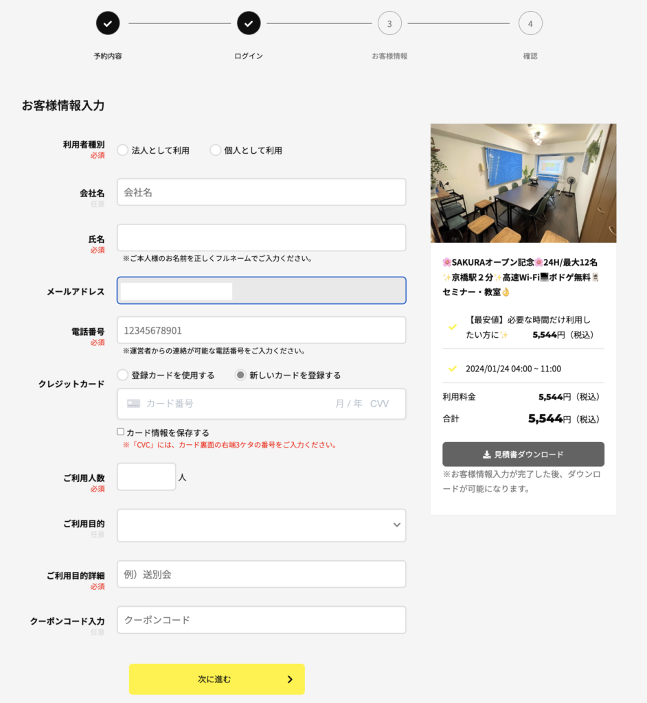 お名前(姓、名)、メールアドレス、電話番号、クレジットカード情報をご入力ください。