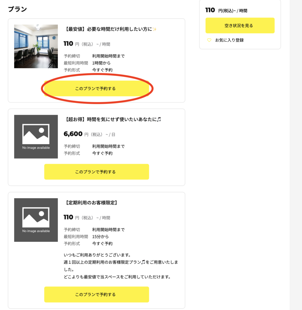 「プラン」一覧から、「このプランで予約する」ボタンを押してください。